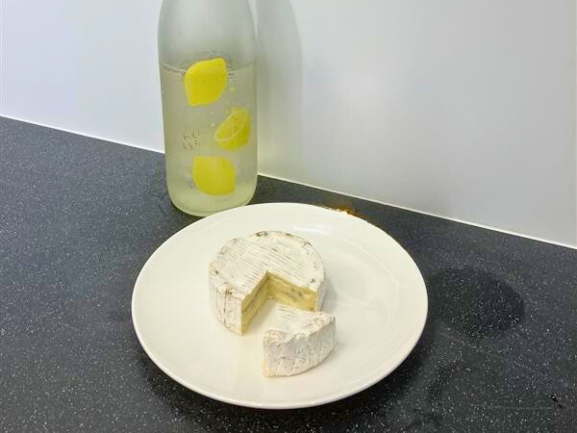 冷やした「れもんしとろん」にカマンベールチーズを合わせてみたところ、意外にもよく合い、レアチーズケーキのような風味に変化しました。