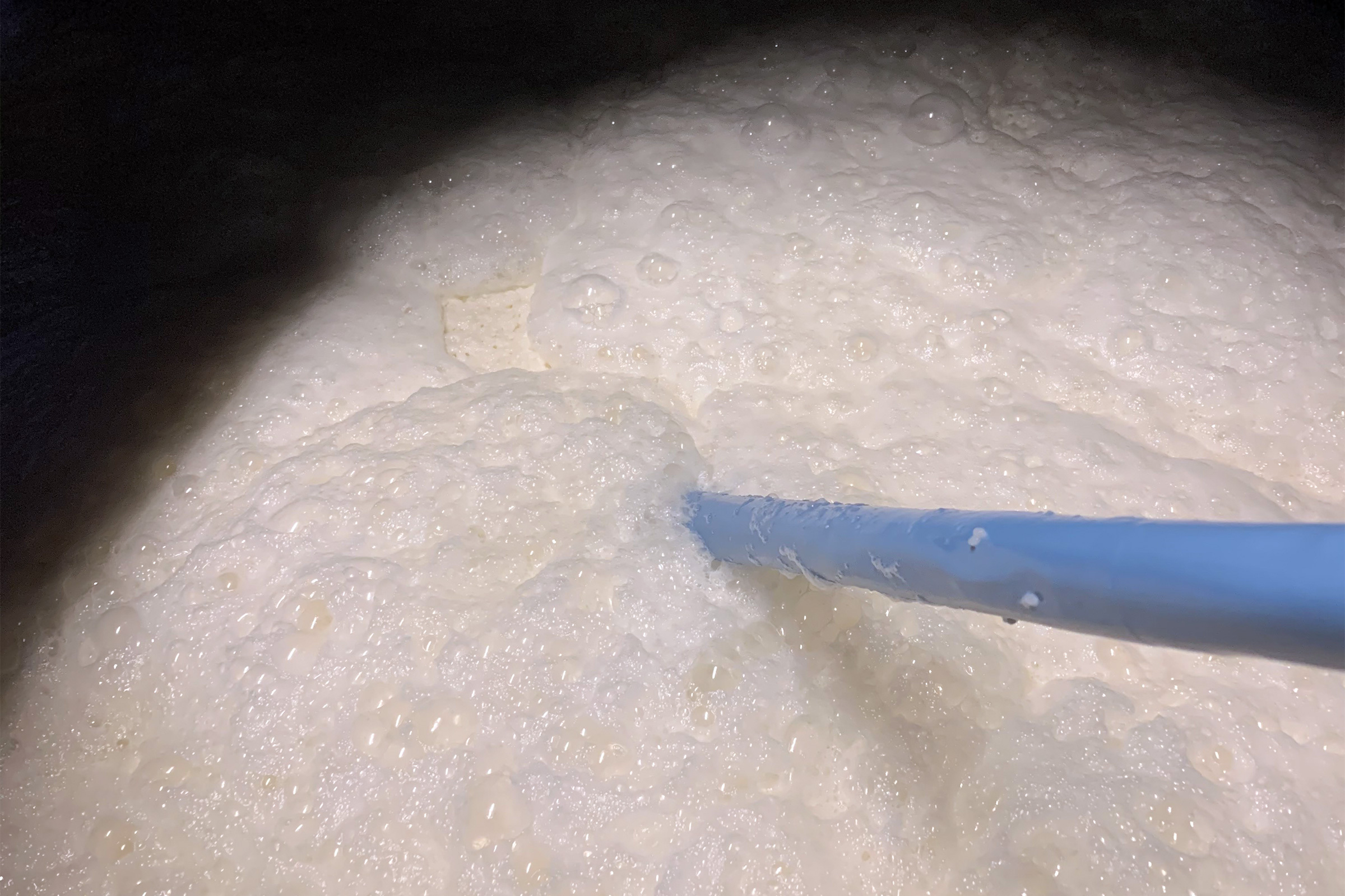 山卸は生酛系の酒母をつくる工程で、蒸米・麹・水を桶に入れ、櫂(かい)と呼ばれる棒を使ってすり潰します。山卸をすることで麹や米成分がよく溶け、乳酸菌が繁殖しやすくなります。