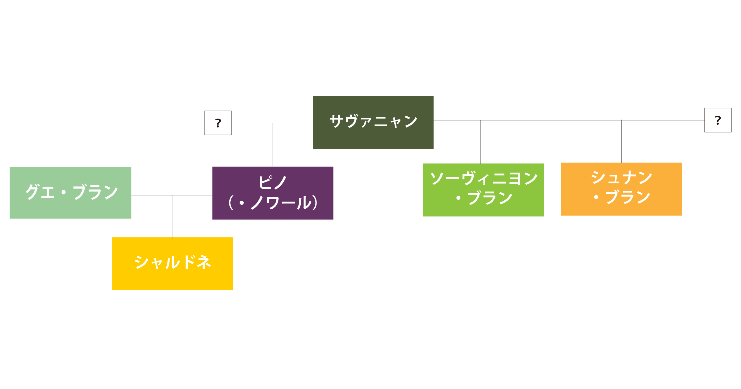 特徴に違いのあるシャルドネとソーヴィニヨン・ブランですが、ブドウ品種の系譜図ではこの2品種は親戚にあたります。どちらも親系統に「サバニャン」という古い品種があり、自然交配の長い歴史のなかで生まれてきました。品種の良さを知った人類が何世代も大切に育ててきたものが、現在私たちを楽しませてくれるワインの姿になっています。