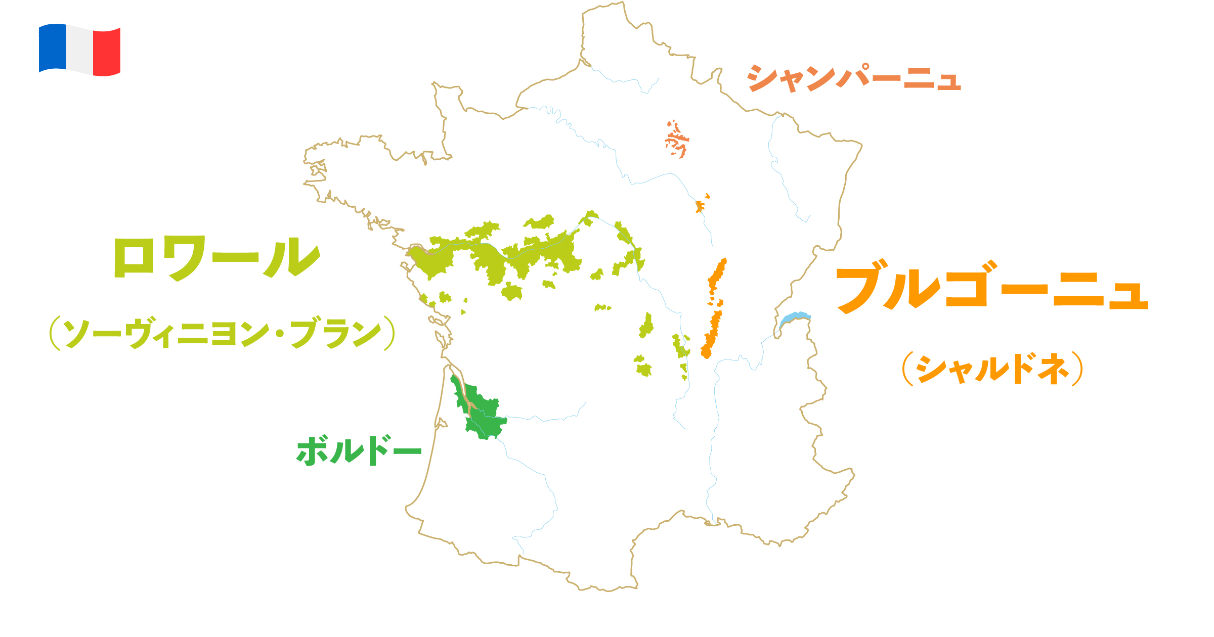 『シャルドネ』はブルゴーニュ地方が発祥とされていて、シャンパーニュ地方などが伝統産地。『ソーヴィニヨン・ブラン』はロワール地方(ロワール河周辺)発祥説が有力で、ボルドー地方に伝わって重要品種になりました。