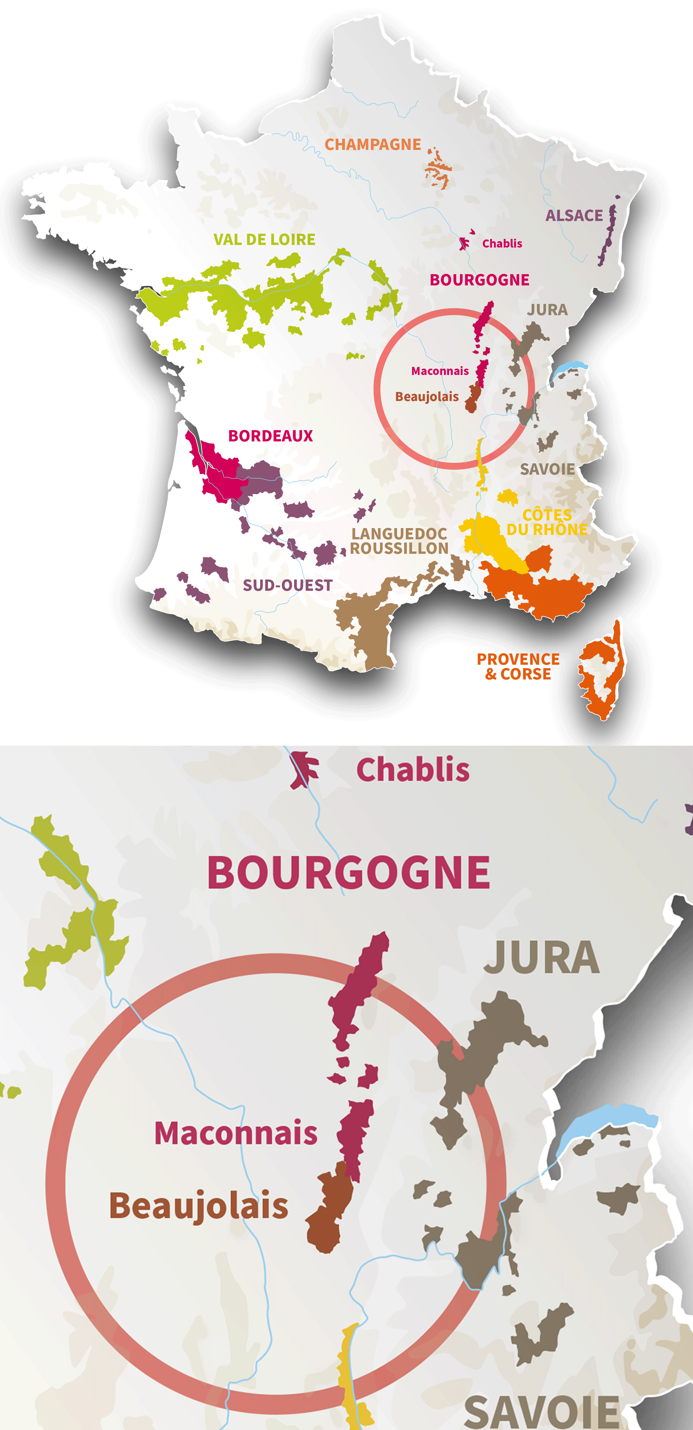 ボージョレ地区の北となりに位置していますが、その境界は地図に引かれた線よりもあやふやなもので、地区が接するエリアのいくつかの村々ではマコン、ボージョレのどちらかを名乗ることが許されています。