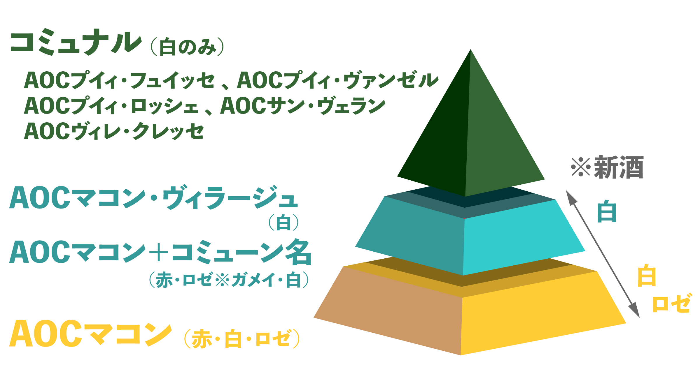 AOCマコンの白・ロゼには新酒「ヌーヴォ(Nouveau)」や「プリムール(Primeur)」の表記が可能です。AOCマコン・ヴィラージュの場合は白ワインのみ認められます。