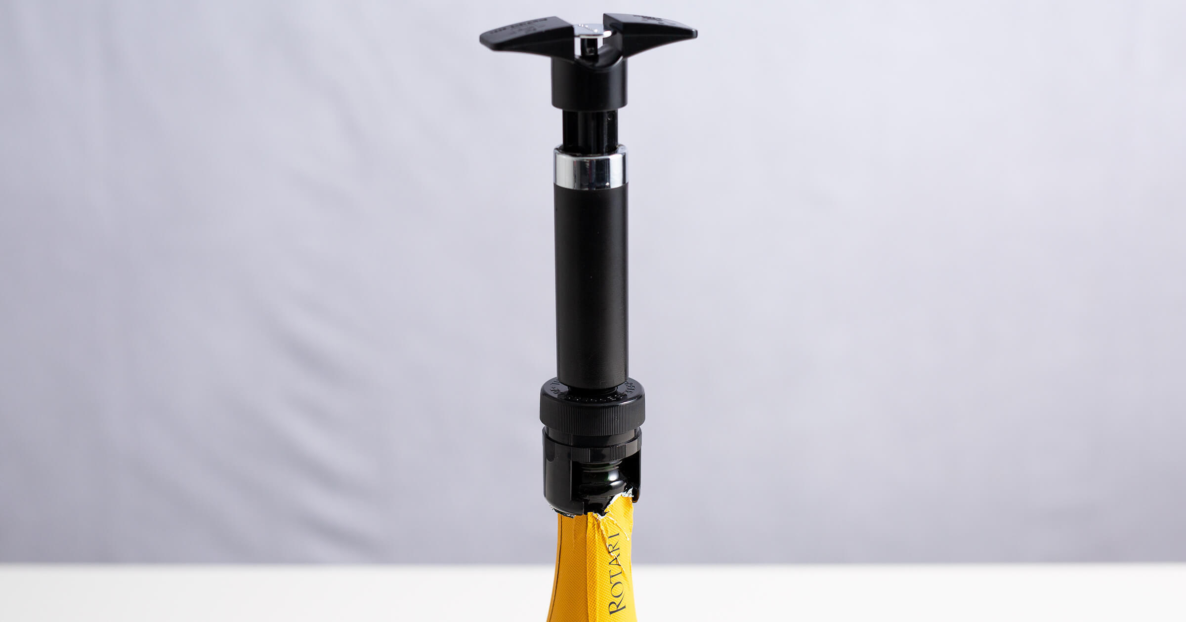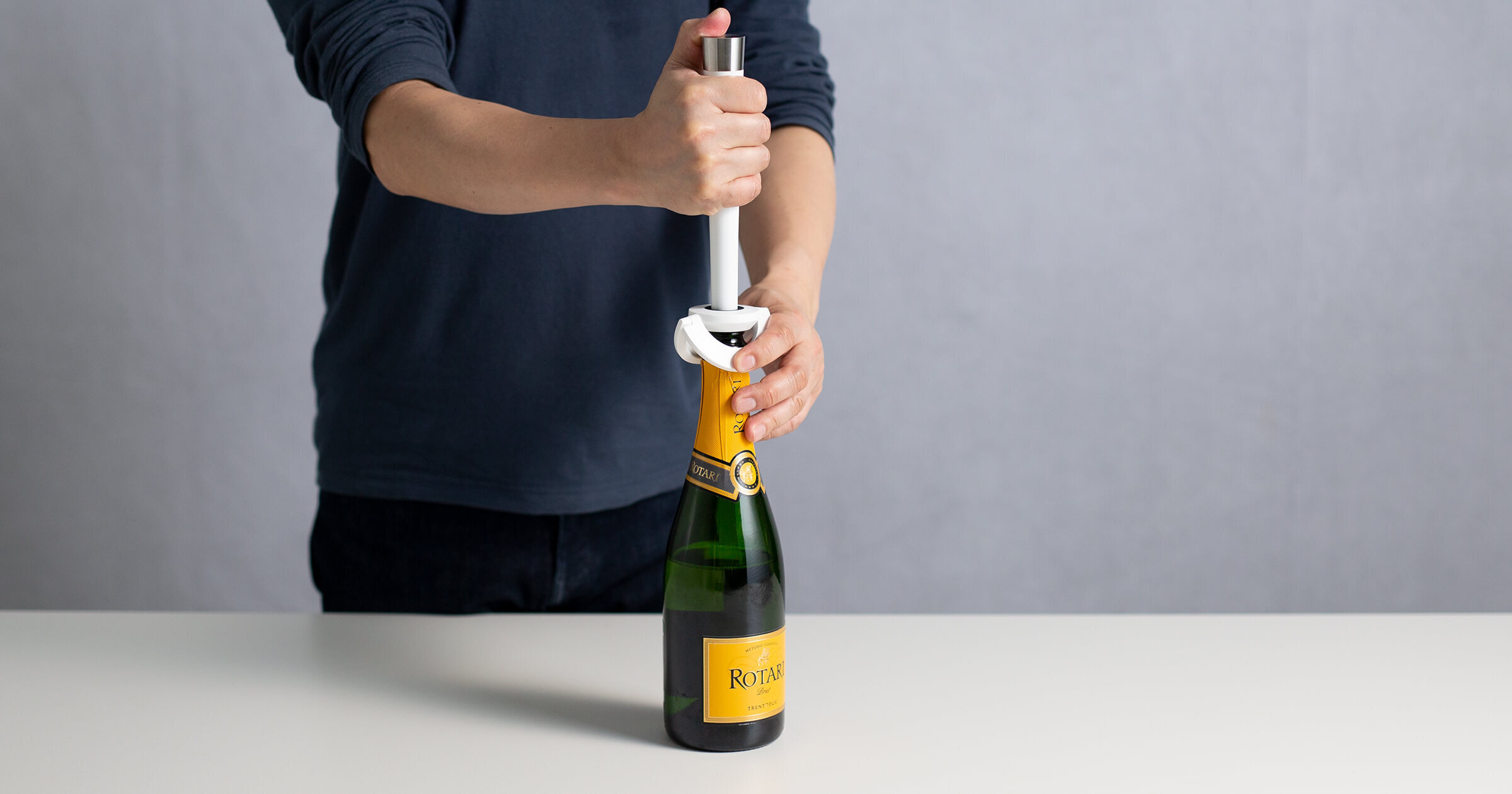 通常はワインボトル内の空気を抜いて酸化を防ぐためのグッズ。この製品にはスパークリングワインの瓶内に空気を入れて加圧する逆の機能がついています。