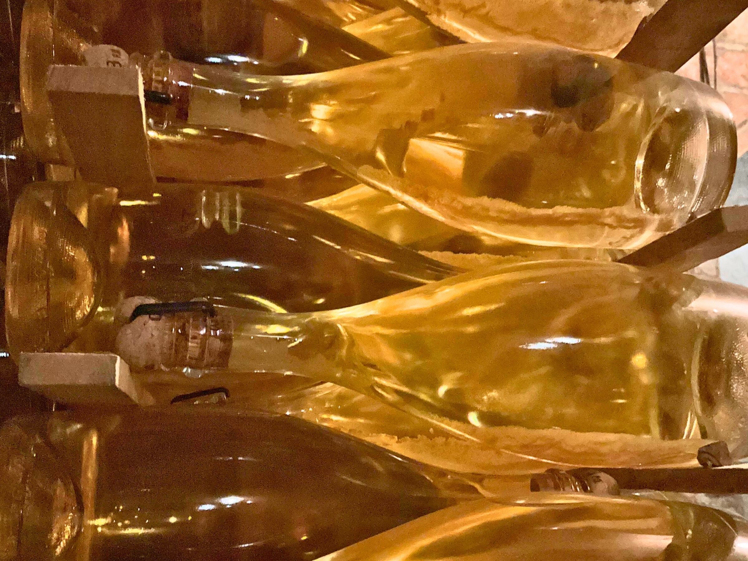 現在は、少しずつ瓶を回したり傾けたりして自動で動瓶を行う機械がありますが、手動で行っていた時代には、職人が数カ月をかけてすべての瓶を動かしていました。