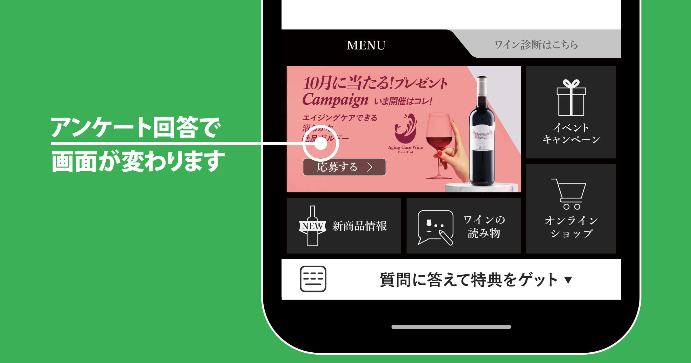 ※初回アンケート(所要時間:30秒)に回答していないと、上図のようなTOPメニューが表示されません。TOPメニューのロックを解除してからご応募ください。