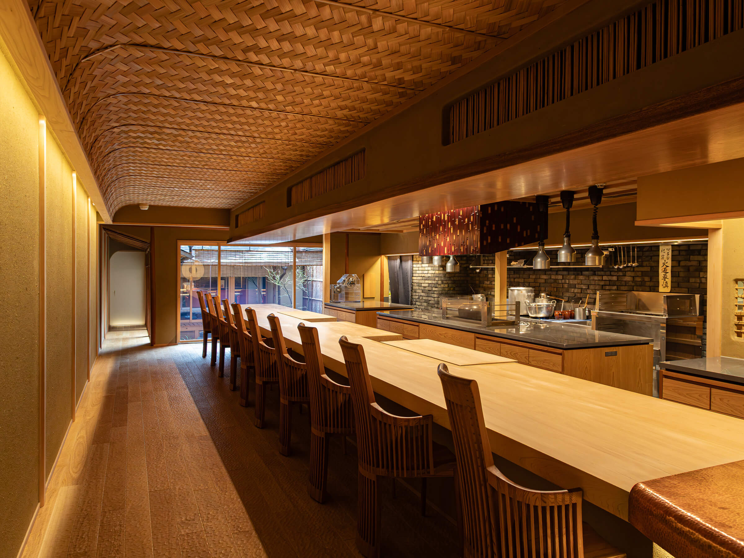 2002年、同エリアに移転の後、2006年、八坂通に100坪の一軒家を購入、同年10月に現店舗を開店。全17席のカウンターは、昼夜共に全席一斉スタート。