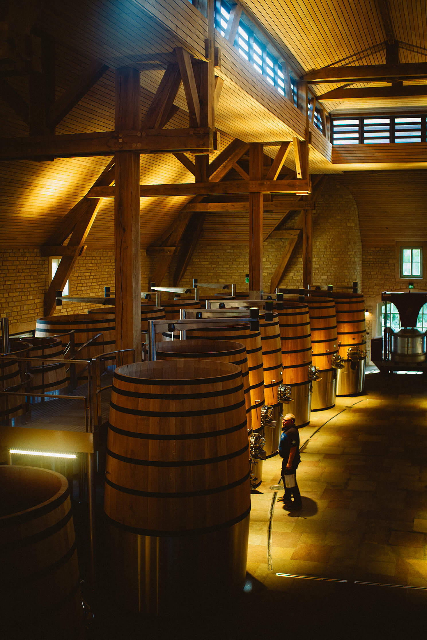 なんでも聞くところによると、パリのノートルダム大聖堂で数年前に大規模な火災が起きた際、修復工事を手掛けた建築家がこの施設も手がけているんだとか。クラシックな醸造施設内がこれだけモダンだなんて、誰が想像できようか。ワイナリーは文化であるけれど、もちろんビジネスでもある。こうやって資本が正しく使われることで、我々に美味しいワインが供されているのか。
